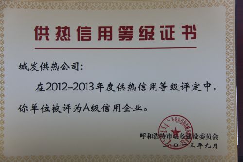 呼市城發(fā)供熱被評為A級信用企業(yè)