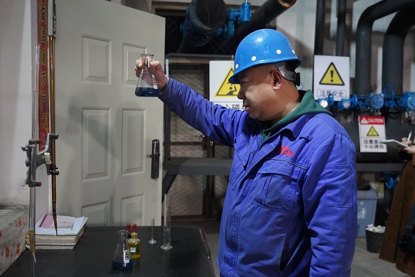 在水化A車間,劉丁一穿上工作服,戴上防護(hù)用具,立刻進(jìn)入工作狀態(tài)。化驗工作枯燥乏味,但對質(zhì)量的要求卻精益求精,從接樣到測量再到數(shù)據(jù)分析,他嫻熟地倒著試劑、觀察著試劑瓶,一支燒瓶、一些水、幾滴試劑,隨著劉丁一搖晃的燒瓶,漸漸的,瓶子中的水從紫紅色,變成了淺藍(lán)色。為了檢驗軟化水的質(zhì)量是否達(dá)標(biāo),確保鍋爐一次網(wǎng)用水安全,這一天他要對水質(zhì)至少進(jìn)行8次檢驗。