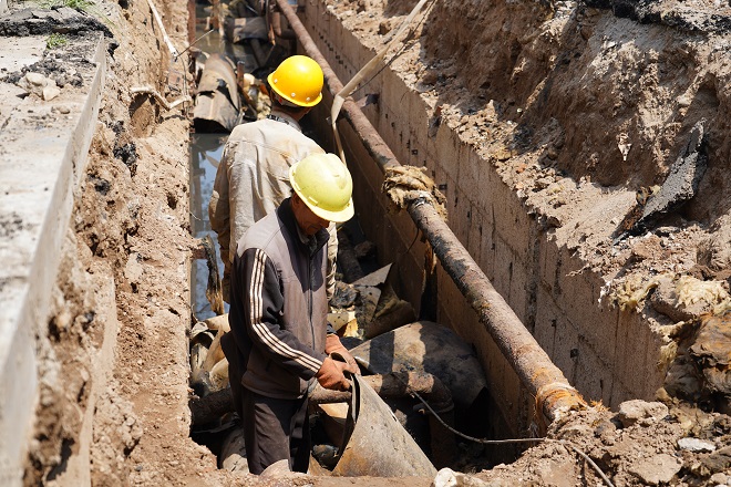 據施工方介紹,"該小區供熱管線總長約7000米,供熱管道因長期浸泡在污水中,腐蝕嚴重。如意小區分A、B、C三個區,還有東西商網,目前僅僅B區的供熱管溝內污水較少,A、C兩個區、東西商網的地溝內幾乎全部是污水,最深的管溝內深度達到了近1.2米,給施工增加了難度。每天早上開始用三臺泵抽排污水,中午休息1個半小時后,開始施工時,溝內又有了污水。尤其是經過一晚上的停工,第二天溝內污水深度又達到了1米多。為確保工期,不影響按期供暖,目前采取分段式施工方案,先抽干地溝中的污水,再進行管道更換。三伏天,工人師傅們穿著連體防水服,忍受著刺鼻的氣味,在污水深達一米多的地溝內,一泡就是一天。施工至今已近二個月,每一天他們都是這樣重復著工作,清理不斷涌出的污水,拆除舊管,鋪設新管,一天的工作后,打濕衣服的不只是污水還有汗水。"