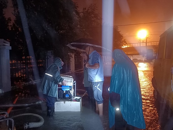 橋靠分公司組織員工們先將防汛沙袋置于地勢(shì)較低的單元門(mén)口,將水泵置于地勢(shì)最低處做好了防汛排水的準(zhǔn)備工作。為了確保人民群眾的生命財(cái)產(chǎn)安全,在做好前期準(zhǔn)備工作后,大家便守在現(xiàn)場(chǎng),密切關(guān)注天氣情況,實(shí)時(shí)監(jiān)測(cè)雨情汛情,雖然白天的天空還能看到藍(lán)天白云,但他們堅(jiān)守崗位絲毫不敢松懈,只是買(mǎi)了盒飯靠在車(chē)旁簡(jiǎn)單的解決了溫飽。13日夜間22時(shí),隨著雨量的加大及降雨的持續(xù),小區(qū)內(nèi)地勢(shì)低洼處排水量開(kāi)始小于降水量,積水深度開(kāi)始上漲。此時(shí)天空就像是開(kāi)啟了“水簾洞”模式,穿著雨衣依舊全身濕透的防汛職工們冒著雨淌著水一遍遍的查看,按照防汛作業(yè)預(yù)案開(kāi)展工作,他們始終堅(jiān)守一線(xiàn)在暴雨中逆行,全力以赴守護(hù)轄區(qū)群眾安危。