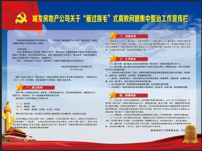 從5月開始,按照市委市政府要求,城發(fā)公司開展了“雁過拔毛”式腐敗問題集中整治工作,公司高度重視集中整治的宣傳和自查工作,并將其作為集中整治“雁過拔毛”式腐敗問題的重要任務,精心組織、迅速行動,總公司制訂了《城發(fā)公司關于“雁過拔毛”式腐敗問題集中整治工作宣傳方案》,各分子公司都結(jié)合自身實際制訂了可操作性強的宣傳方案,讓廣大職工群眾知曉并支持,參與集中整治。公司通過總公司及分子公司各級網(wǎng)站、微博、微信公眾號、微信群、LED大屏幕、LED條屏、噴繪宣傳板、條幅、宣傳欄、動員會議面對面宣傳等10多種載體和形式,30多幅宣傳內(nèi)容認真進行了宣傳,確保把集中整治“雁過拔毛”式腐敗問題工作深入宣傳至一線干部職工中,讓廣大干部職工及群眾充分了解并參與到宣傳工作中,通過廣大干部職工將宣傳活動輻射到千家萬戶,提高了社會群眾對集中整治“雁過拔毛”式腐敗問題工作的知曉度。
